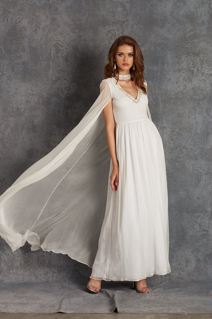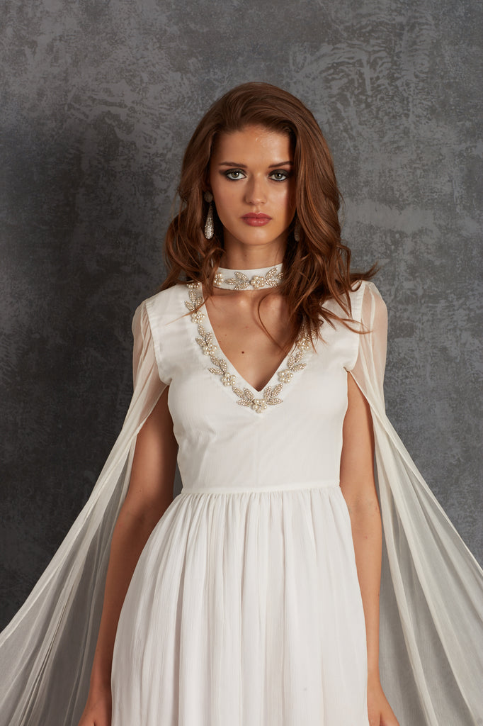 A pure white chiffon dress delicately hand embroidered with fine crystals and pearls on the collar and neck line in Nida Shay's signature floral leaf pattern.